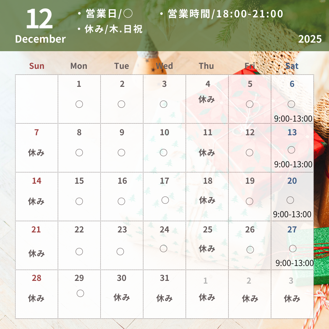 | 18:00〜21:00 | ● | ● | ● | - | ● | - | - |